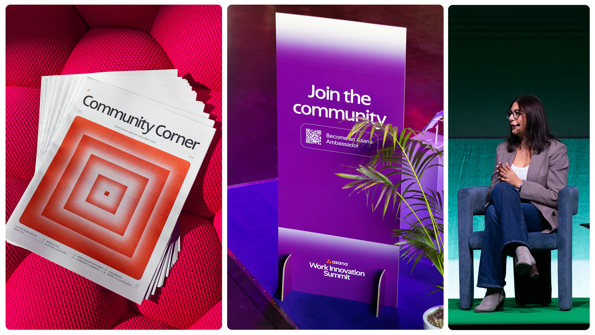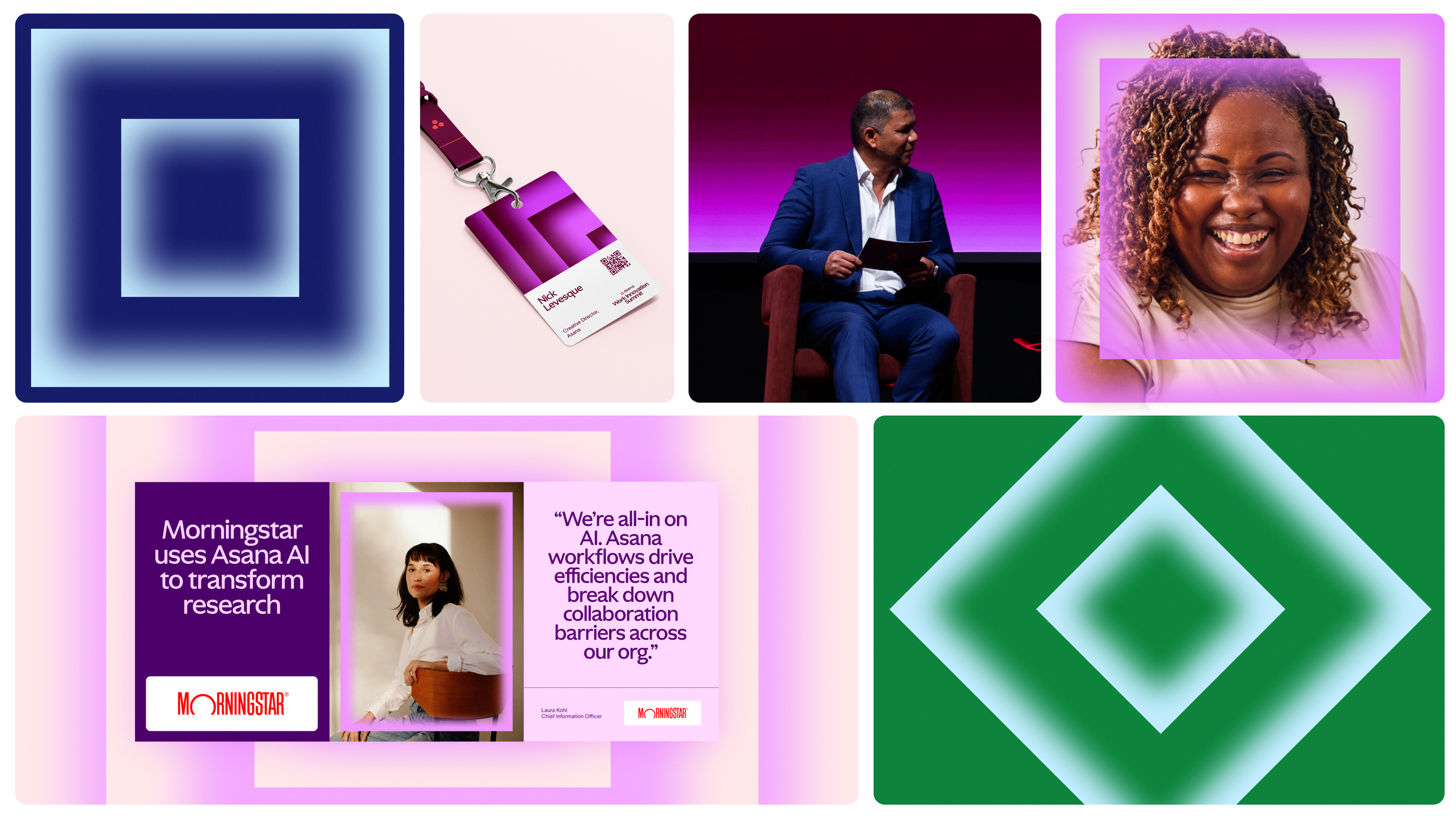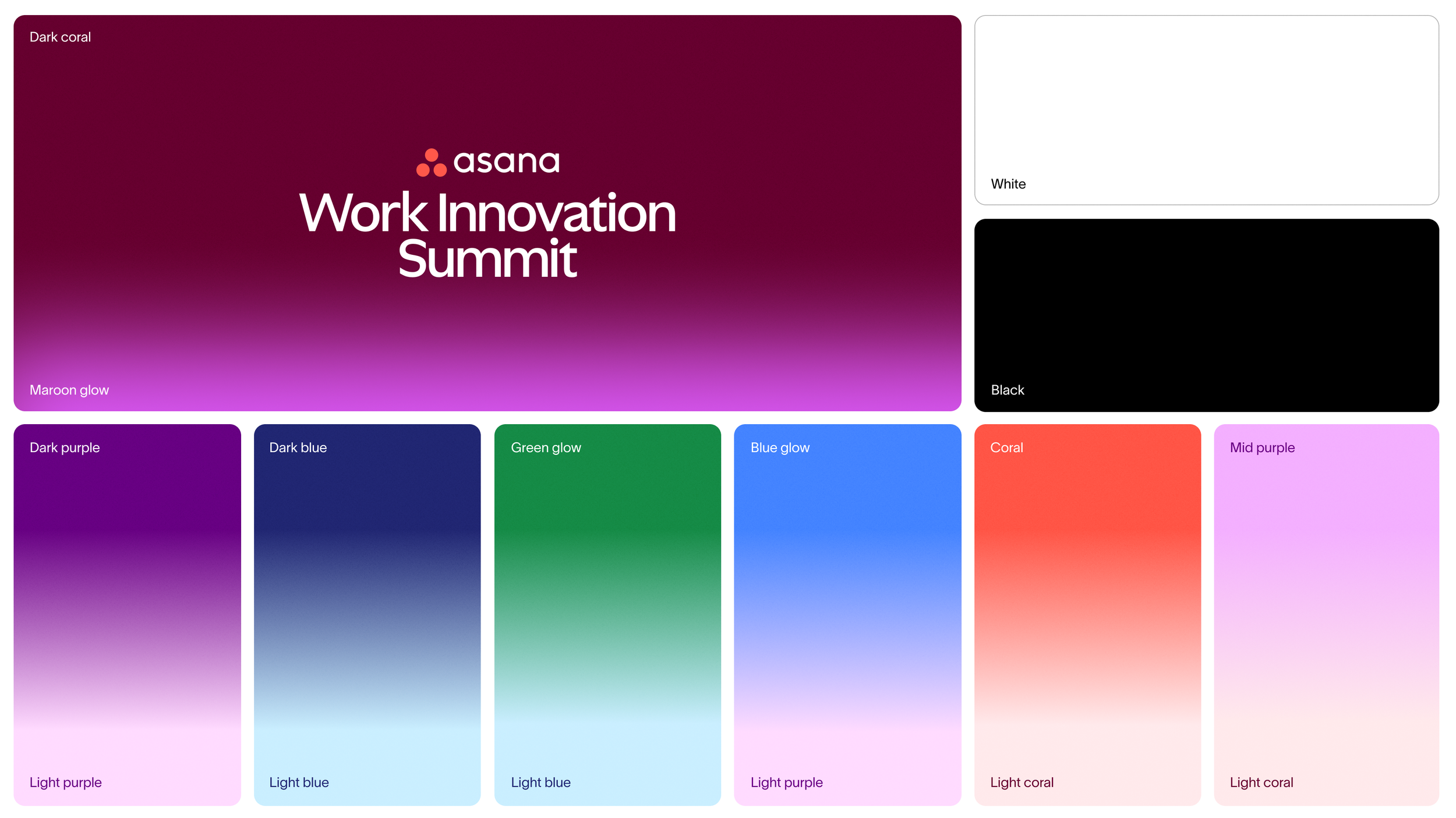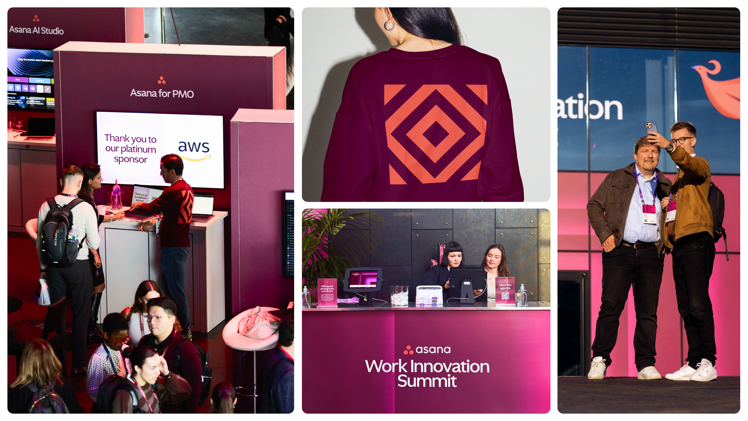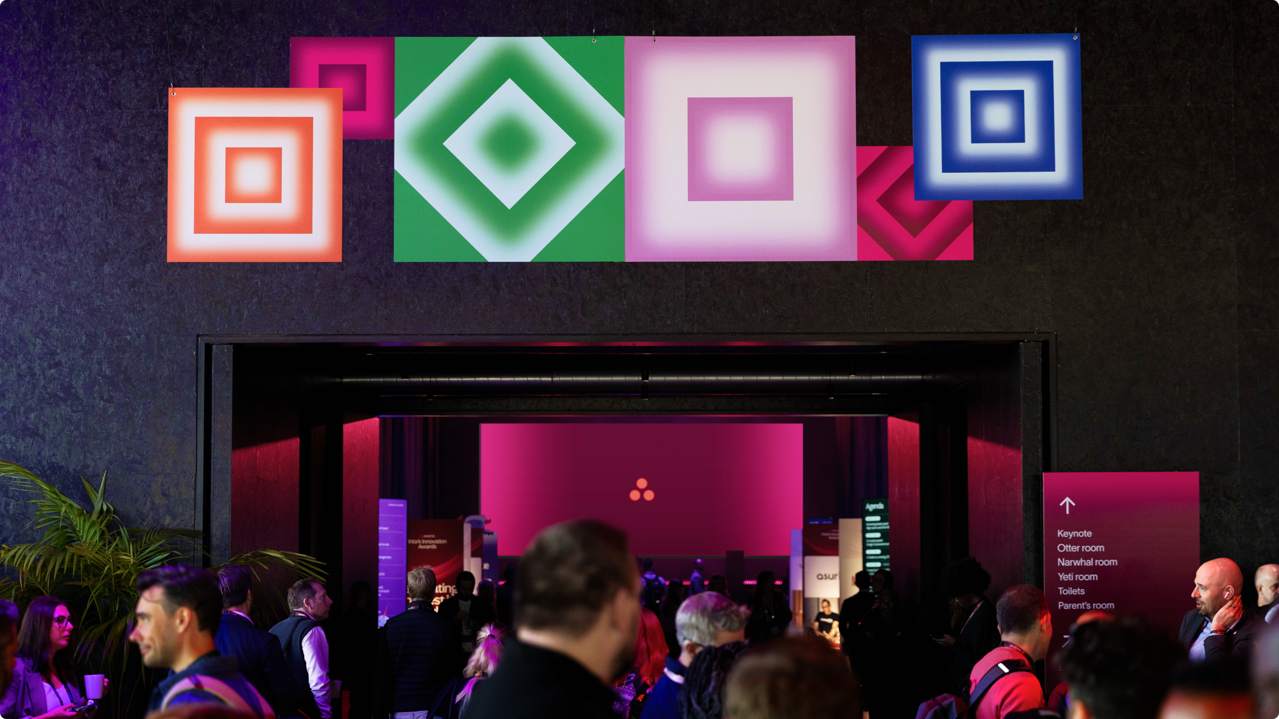 The color palette was pulled from Asana’s AI branding and expanded on. The energizing colors were designed to flex across stages, content, signage, and activations ensuring consistency and distinction.